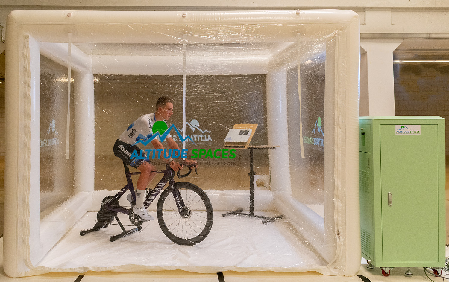 Door het gebruik van een geavanceerde technologie kunnen we de effecten van slapen en trainen op hoogte veilig en effectief simuleren. De hoogtetenten worden aangesloten op onze Altitude Spaces hoogtesimulatie generator die de lucht in de hoogtetenten vergelijkbaar maakt met berglucht. Dit alles gebeurt op een veilige manier zonder gebruik van chemicaliën of extra gassen. De geproduceerde lucht in de hoogtetenten kan gebruikt worden voor verschillende soorten gesimuleerde hoogtetrainingen waaronder ‘Live High, Train low, ‘Hypoxic workouts’ en ‘Intermittent Hypoxic Training’. Je traint naargelang de methode tussen zeeniveau en 6000m hoogte. Zo loop je comfortabel op de loopband of train je op je rollen zonder belemmerend mondmasker en toevoerslang.